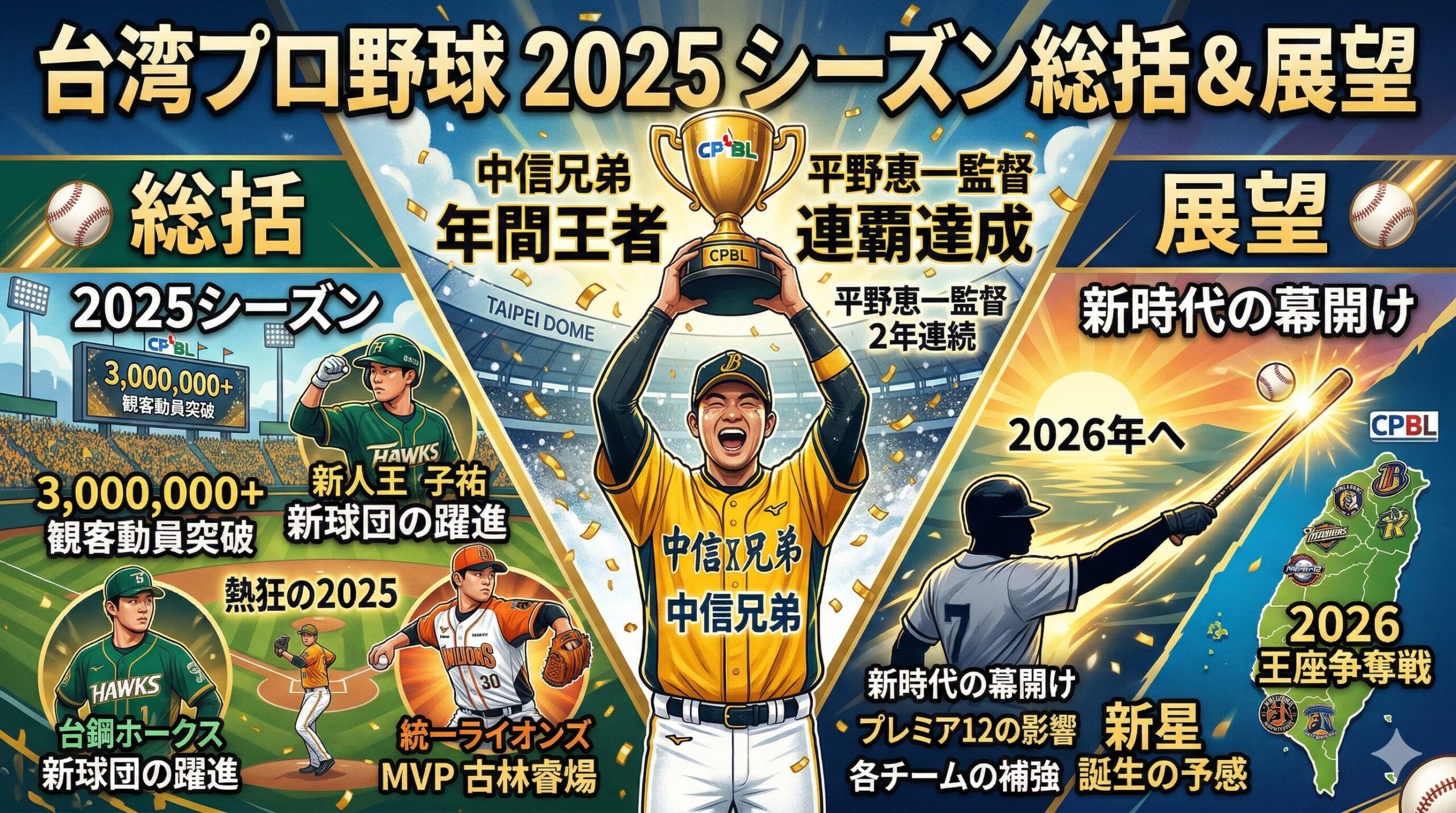 2026年のCPBLは、FA市場の成熟 7、データ重視の近代戦術への移行 4、そして新インフラ(台北大巨蛋・亜太主球場)の稼働 1と、すべてが新しい次元に突入します。レジェンド陳鏞基の引退という感動的なドラマの裏で 21、徐若熙や林詩翔、韋宏亮といった次世代のスターたちが新しい舞台で躍動します 3。6球団の実力がかつてないほど拮抗する2026年シーズン、絶対に見逃せません!今年も台湾プロ野球を全力で楽しみましょう!✨