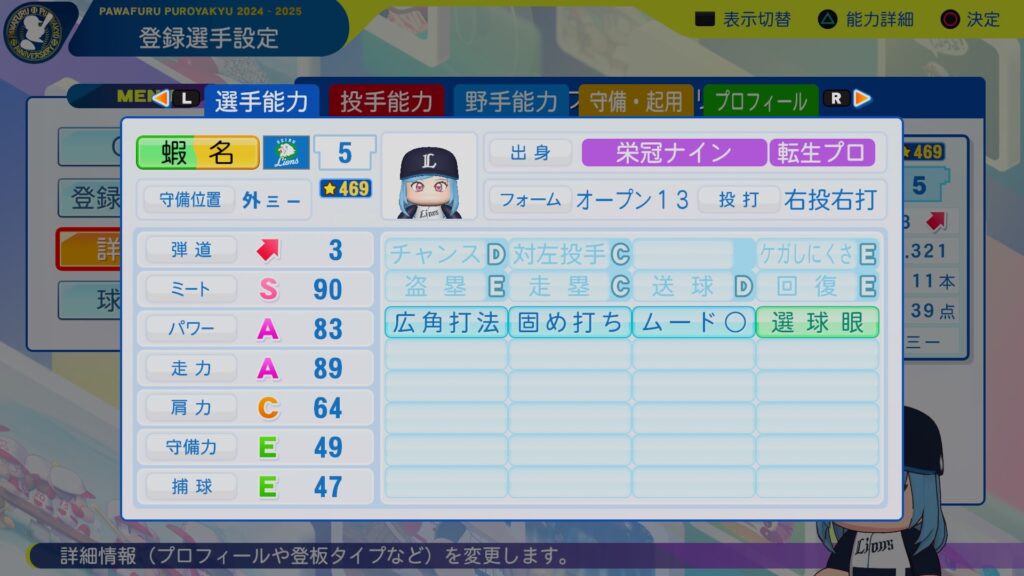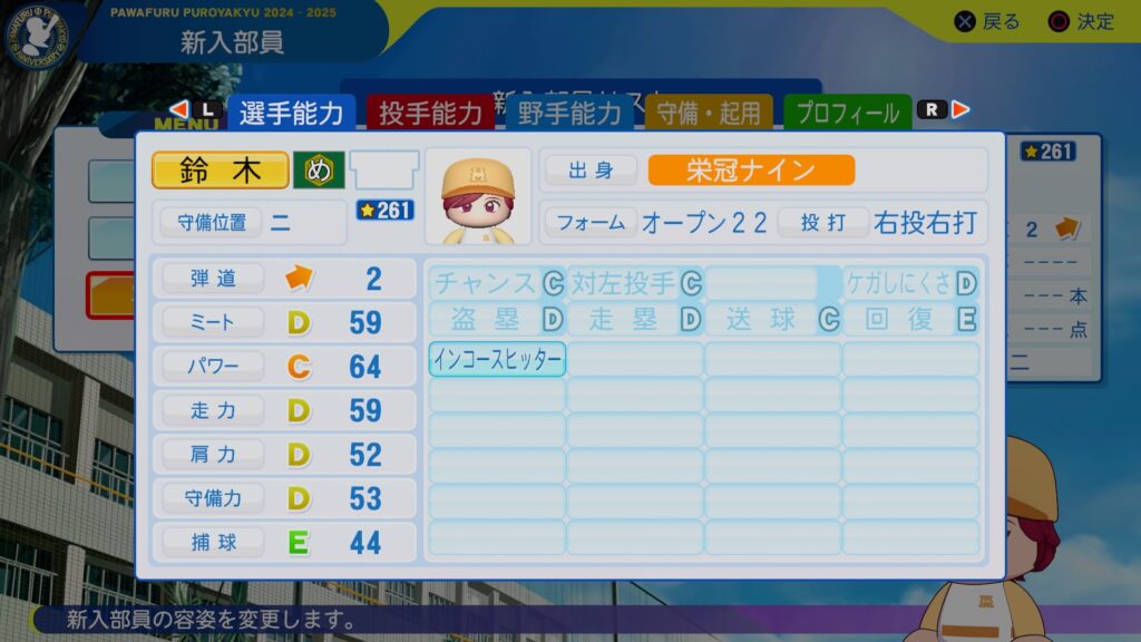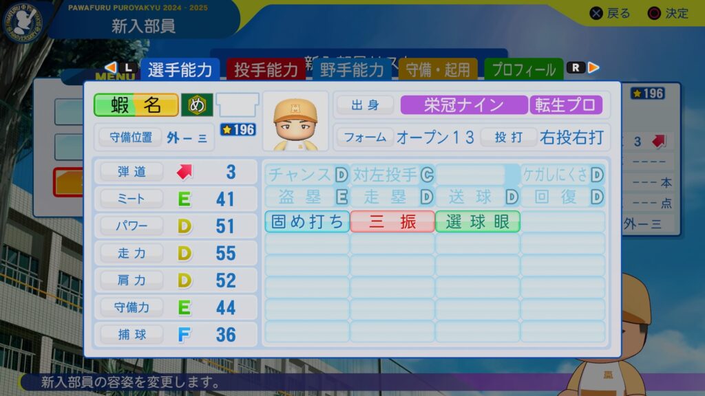 • 杉本君 [外] (やんちゃ) ★178 強肩強打の外野手になる感じかな。走力、守備、捕球と上げるところが多めなのは難点だけど、全然悪くない感じ。