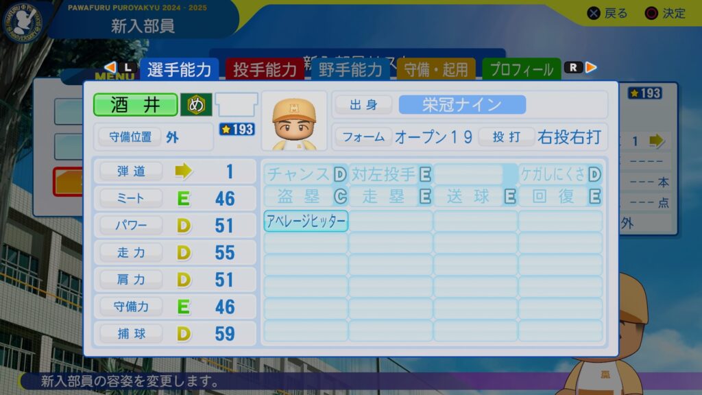 ・酒井君 [外] (お調子者) ★193 バランス良い外野手っすね。アベヒ(アベレージヒッター)持ちは偉いので、2年生の頃には中軸打者になるんじゃないかなぁ。ただ、今年は似た感じの選手が多いからなぁ……。
