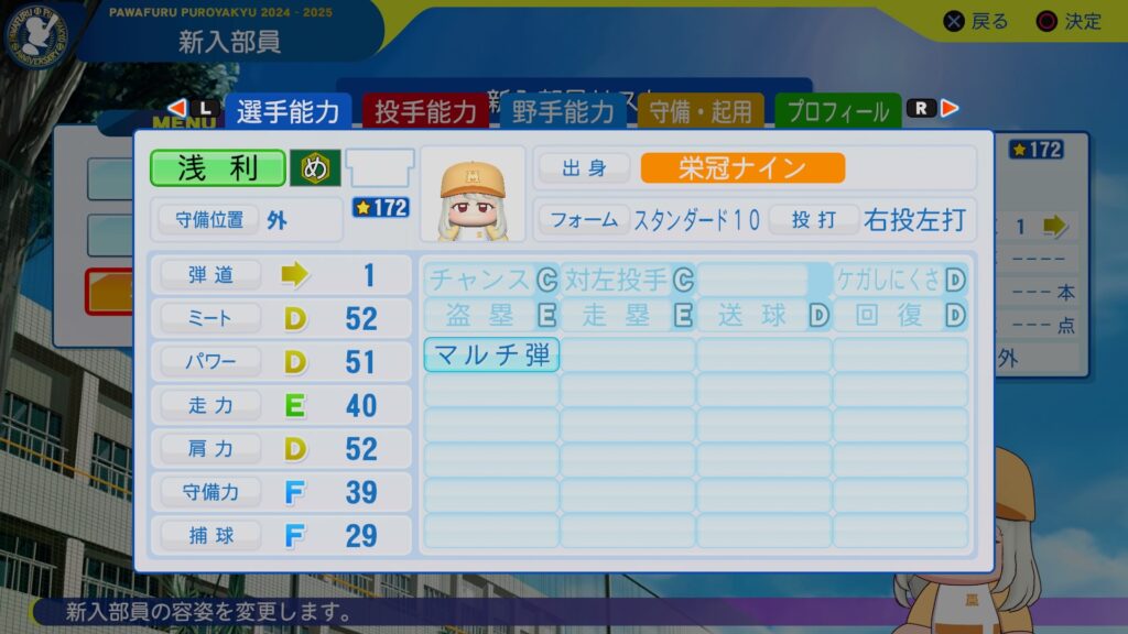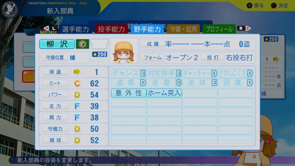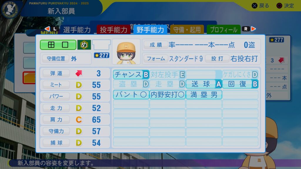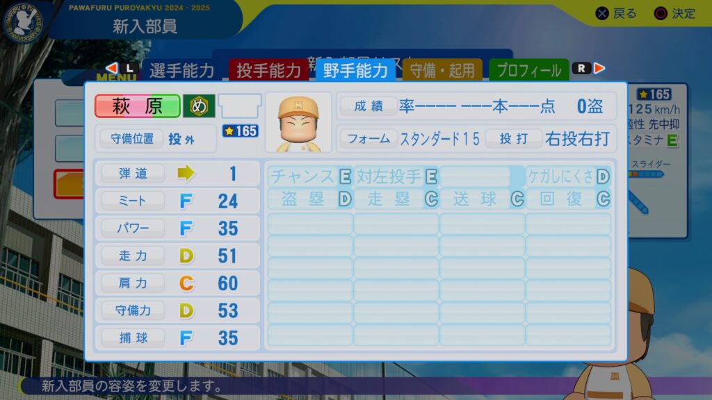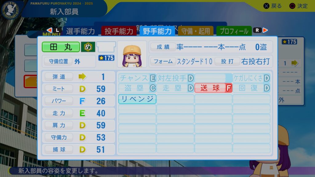 バランスよさげな外野手が来ましたね。守備周りを育てる必要がないんで、ミートパワーだけ上げていって将来的にはクリーンナップを担ってもらいたいところですな。