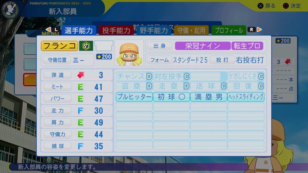 転生プロのフランコ君が来ましたね。まぁすごい強い感じではないですが、弾道上げる分が節約できるんで、その分で強打者に育ってもらえればいいかな。