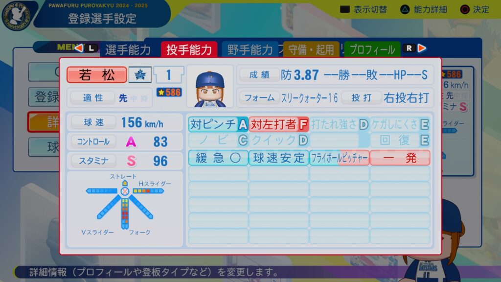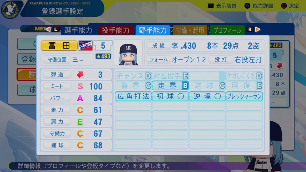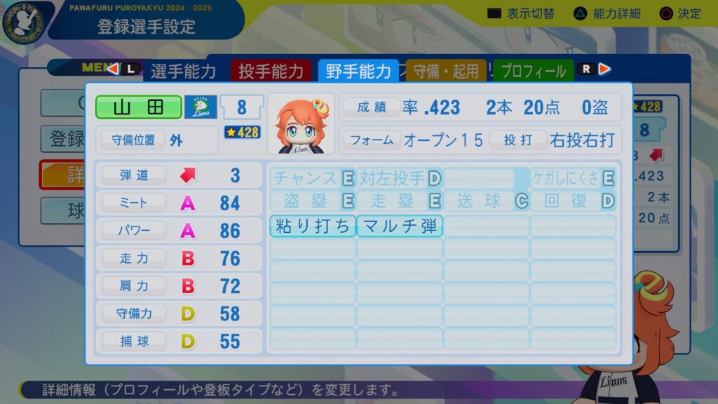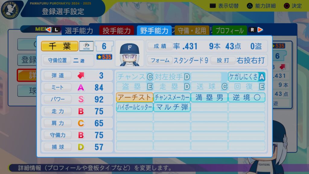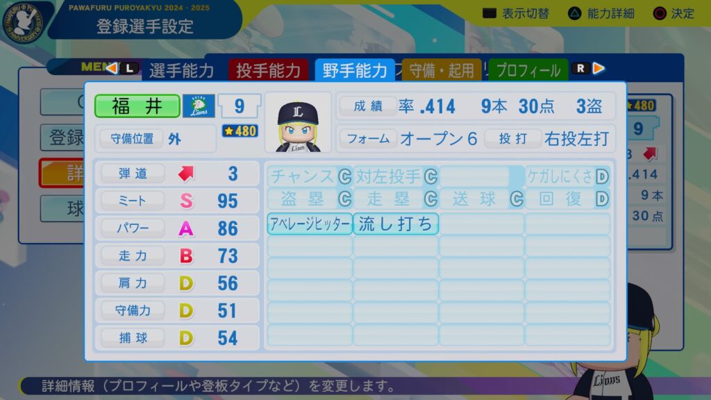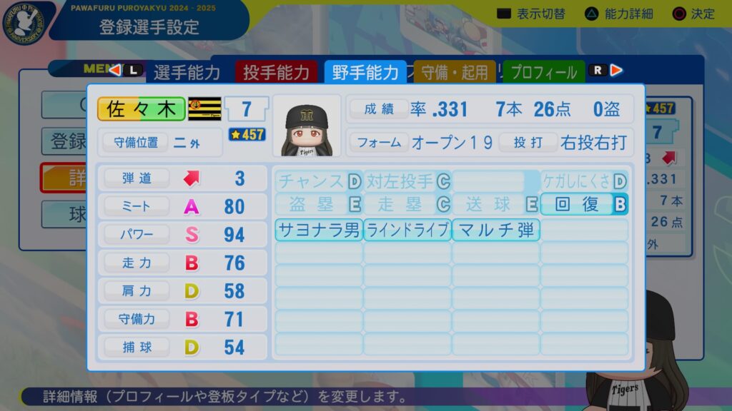 ミートカンストに広角打法持ちの巧打者。パワーも十分にあり、3割30本は目指せそうな逸材。守備範囲・捕球は十分だけど、肩は物足りないので、一塁手転向もありうるかな。