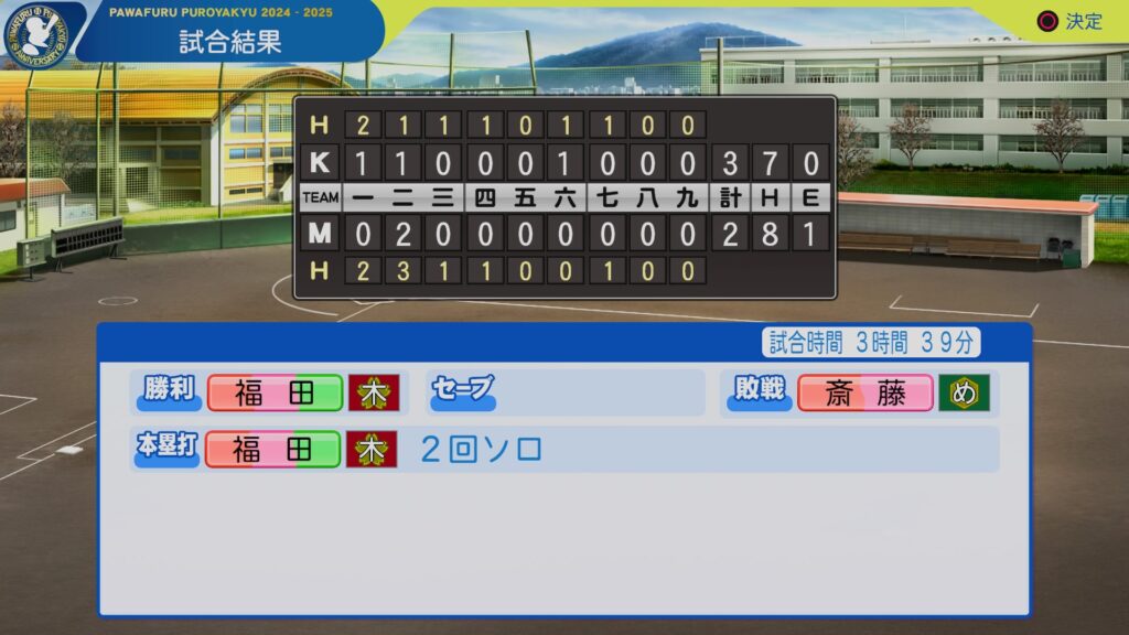 | 8番:斎藤君(1年)[投] | 5打席 | 率.000 | 率.000 | 率.000 | 0本 | 0点 | 0盗 |
