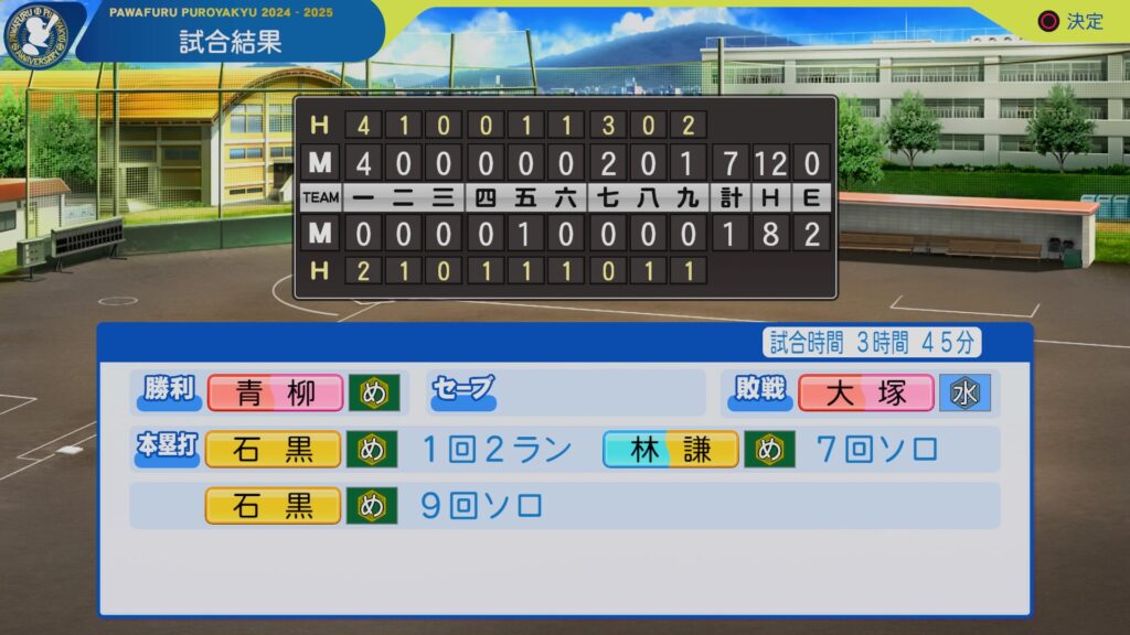 初回から石黒君の2ランを含め、4点を先制すると、7、9回にもホームラン等で追加点を上げて7点を奪い勝利。