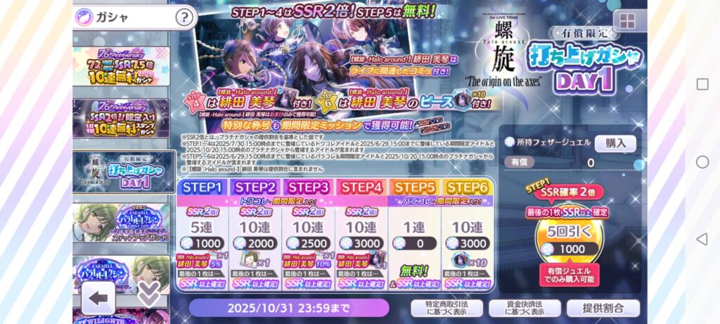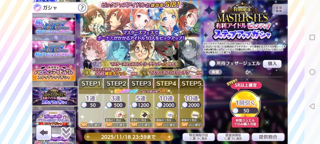 - 有償限定 マスターズフェス有利アイドルピックアップステップアップガシャ [~11/18 23:59]