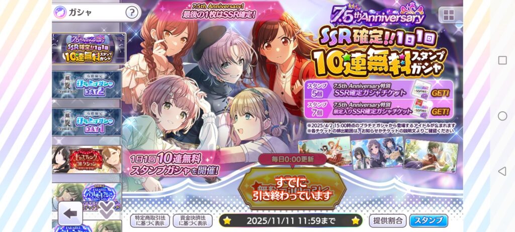 - 7.5th Anniversary SSR確定!! 1日1回10連無料スタンプガシャ [~11/11 11:59]