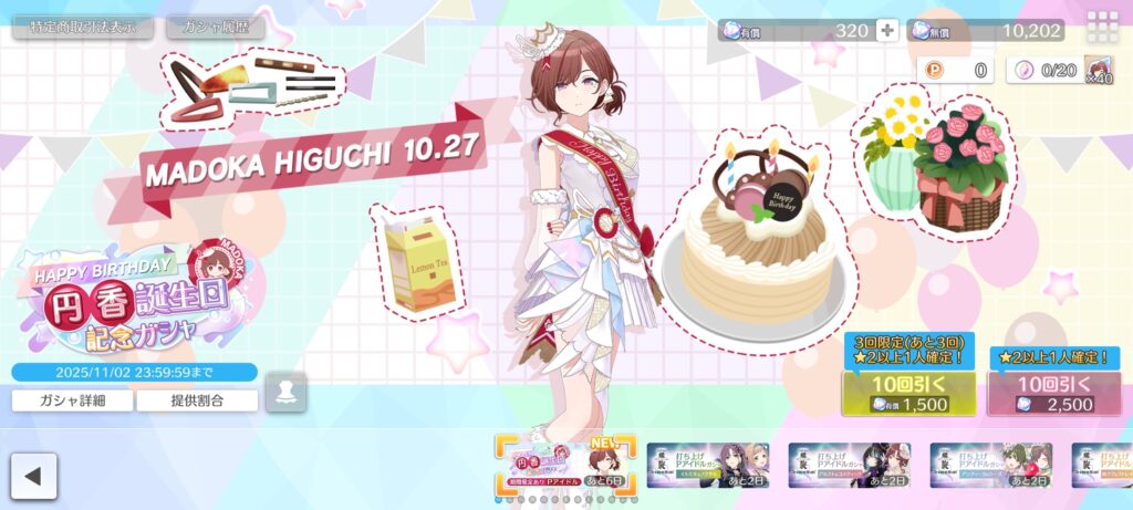 | シャニマス | 7.5th Anniversary SSR2倍!!1日1回10連無料ガシャ [~10/20 11:59] | |