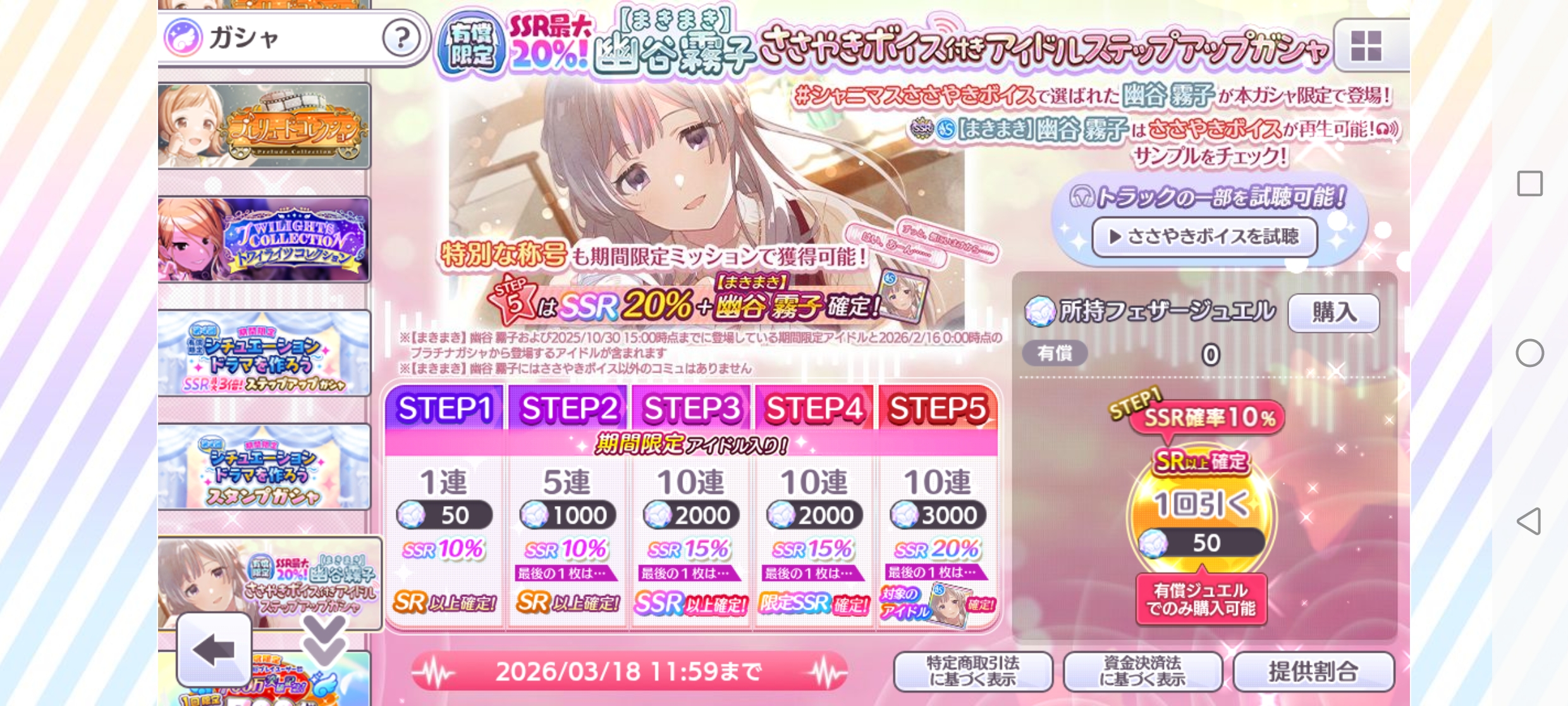 有償限定 SSR最大20%!【まきまき】幽谷 霧子 ささやきボイス付きアイドルステップアップガシャ