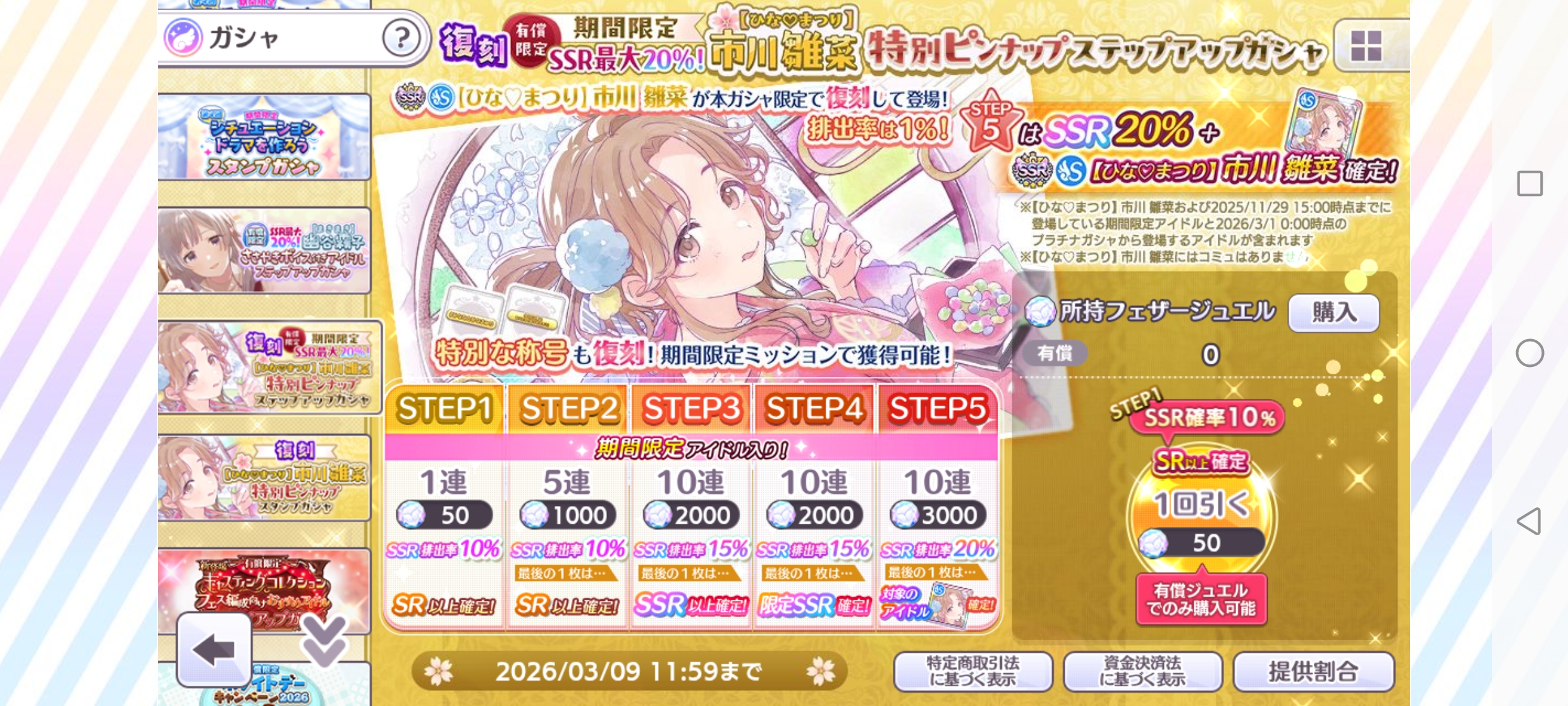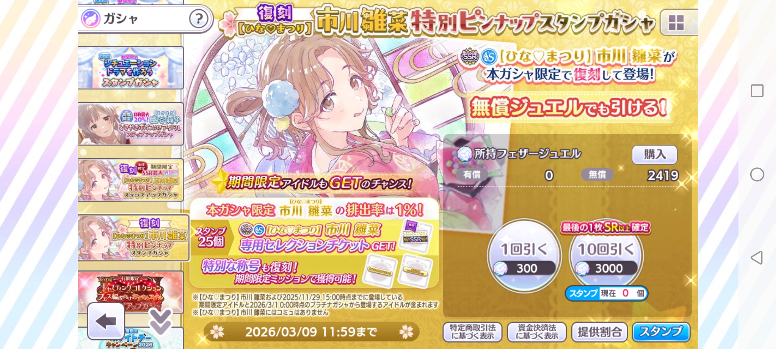 | 03/01(日) | 🪽 シャニマス | 復刻 有償限定【ひな♡まつり】市川 雛菜特別ピンナップステップアップガシャ [~03/09 11:59] |