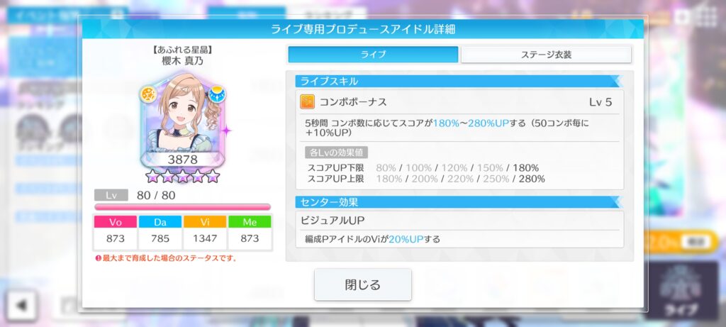 5秒間 コンボ数に応じてスコアが180%~280%UPする(50コンボ毎に+10%UP)