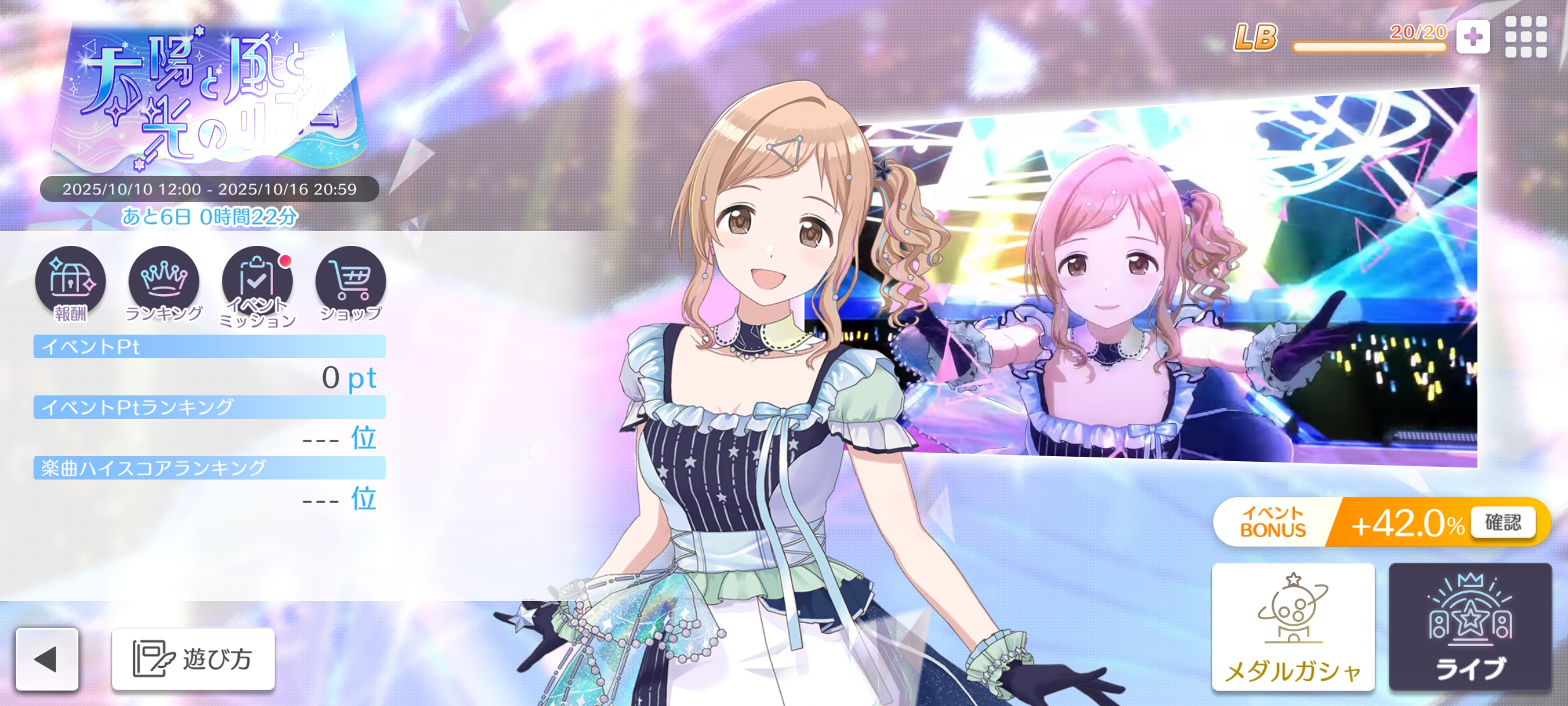 LBを消費してライブを行い、イベントptメダルとメダルを集めて、メダルガシャを回して報酬を獲得するイベント。時間がない人は、LB20倍でスキップライブで進めるのがおすすめ。