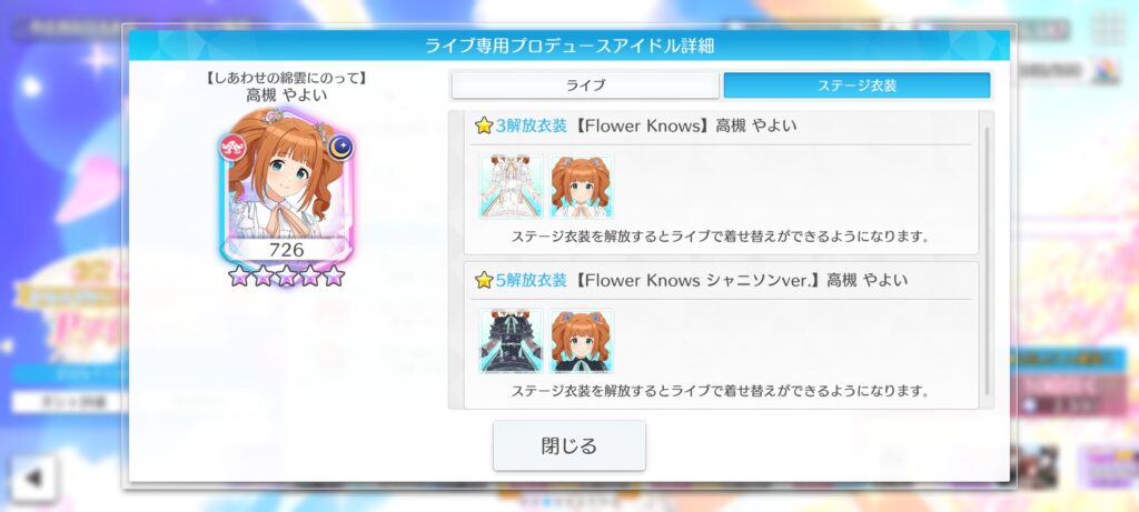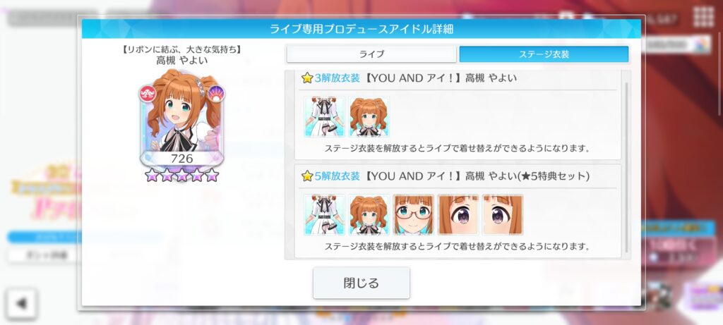 | 高槻 やよいの信頼度を3にしよう | ・ドレスオーダーチケット×50 |