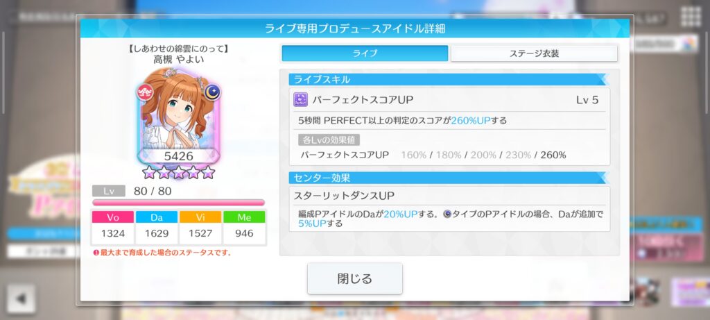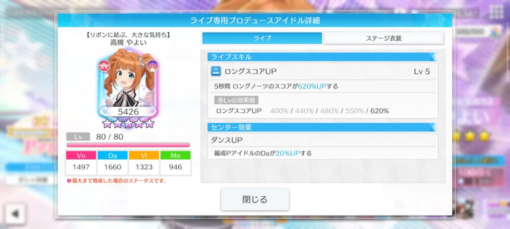 編成PアイドルのDaが20%UPする。スターリットタイプのPアイドルの場合、Daが追加で5%UPする