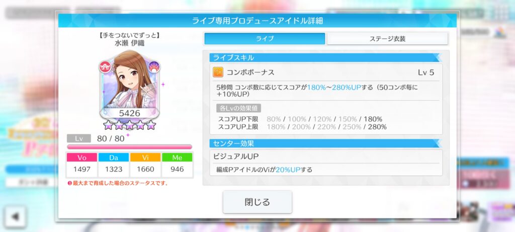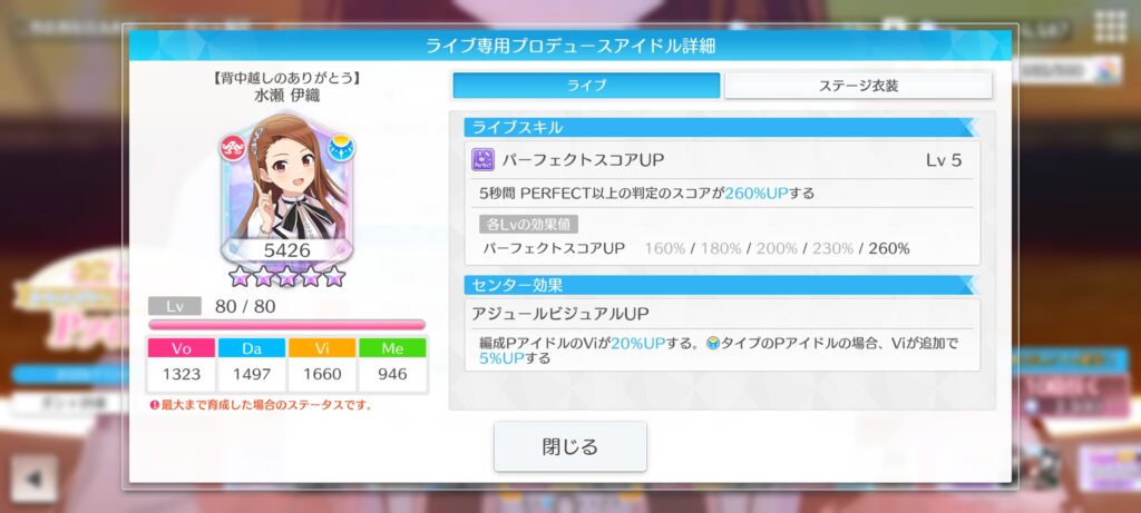 編成PアイドルのViが20%UPする。アジュールタイプのPアイドルの場合、Viが追加で5%UPする