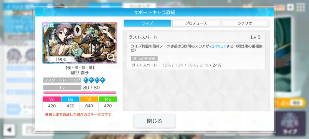 ライブ終盤の最終ノーツ手前の3秒間のスコアが+24%UPする(同効果の重複無効) ※Lv5時