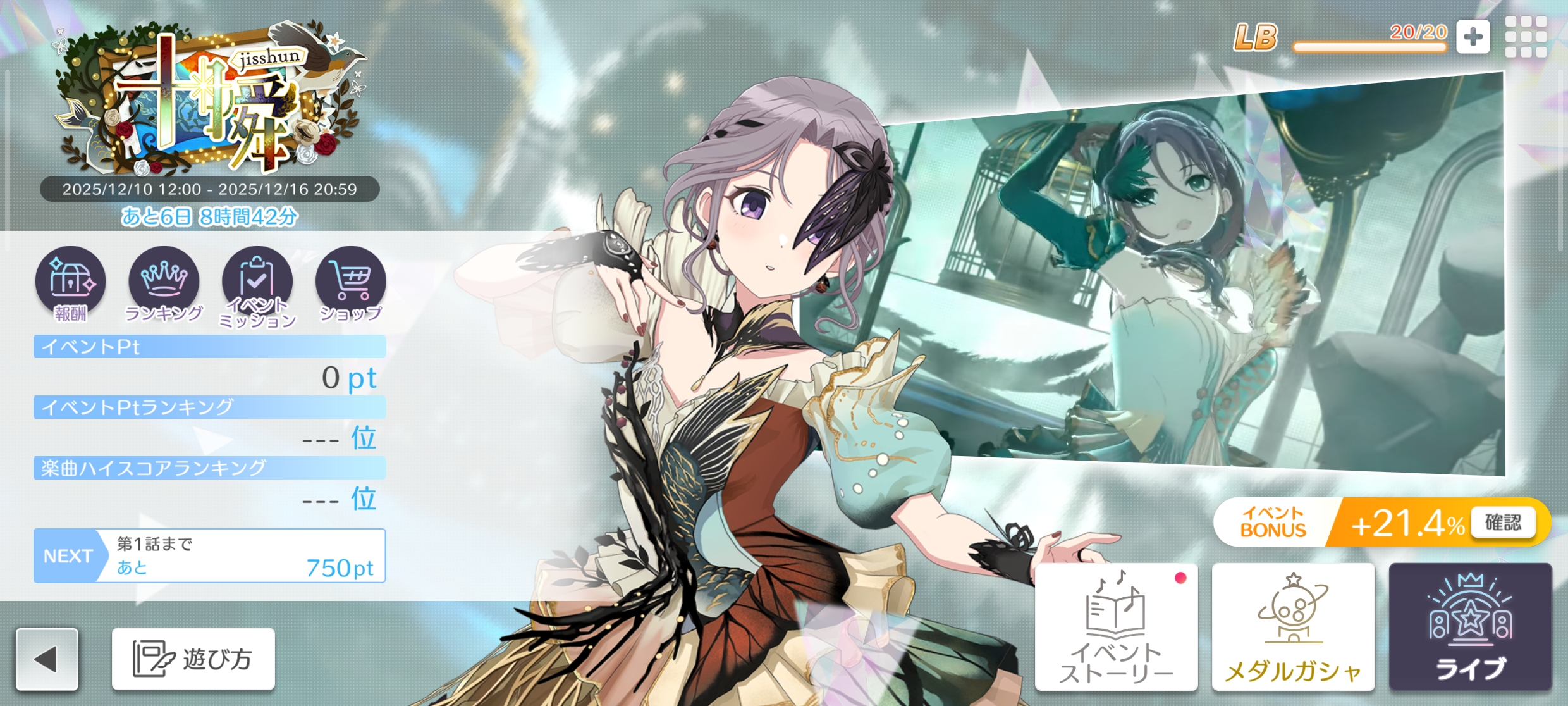 LBを消費してライブを行い、イベントptメダルとメダルを集めて、メダルガシャを回して報酬を獲得するイベント。時間がない人は、LB20倍でスキップライブで進めるのがおすすめ。