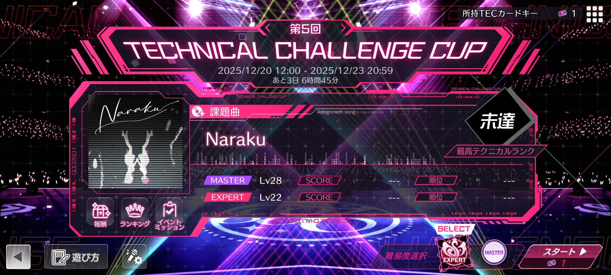 このイベントはイベントミッションから獲得できるTECカードキーを使用し、課題曲のテクニカルスコアアタックに挑戦するイベントとなります。