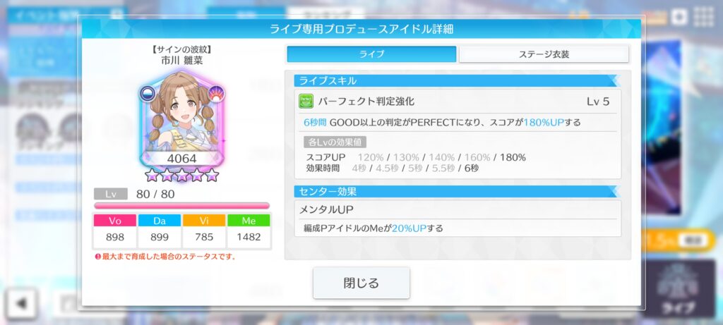 6秒間 GOOD以上の判定がPERFECTになり、スコアが180%UPする ※Lv5時
