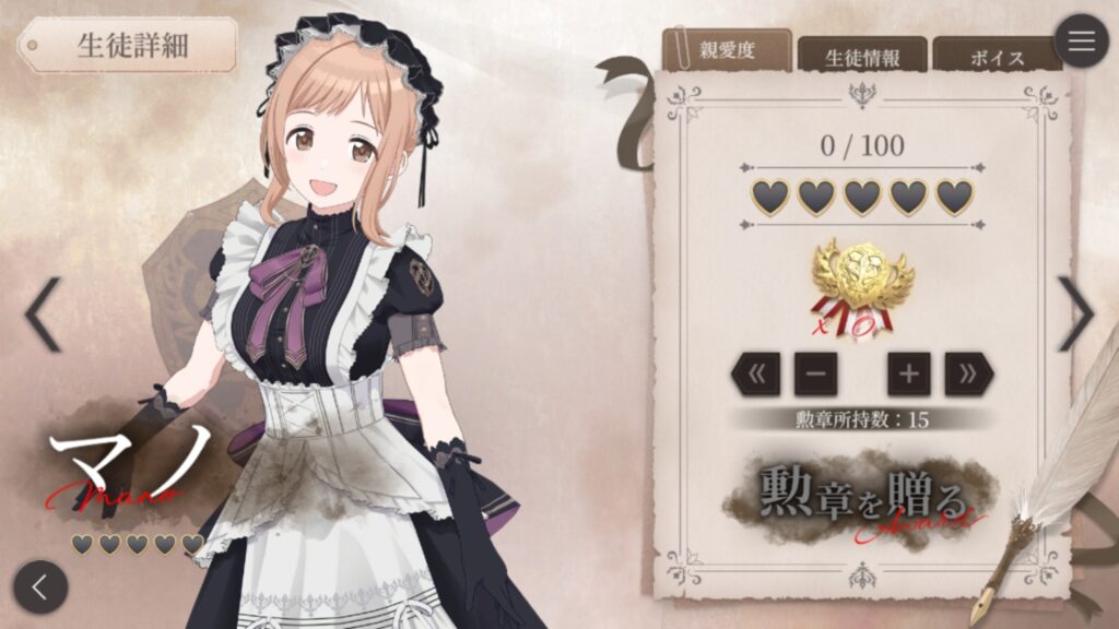 モバイル>イマジナリーレイド>生徒名簿>生徒詳細から勲章をプレゼントすることで親愛度をあげると、虹の結晶などのアイテムや限定ボイスを獲得できる。