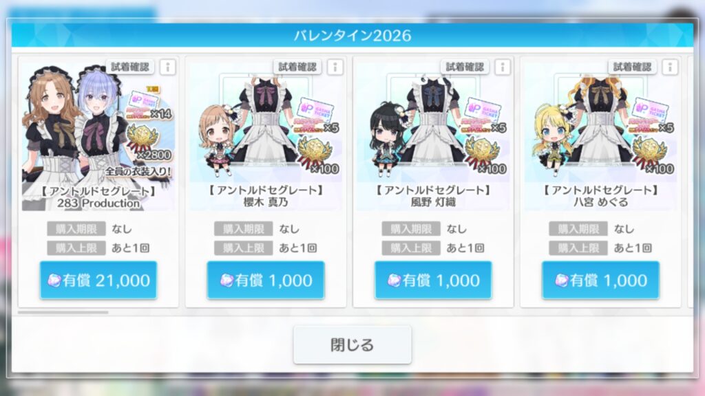 バレンタイン2026衣装には、アイドル単体セットと283プロ全アイドルセットの2タイプあります。
