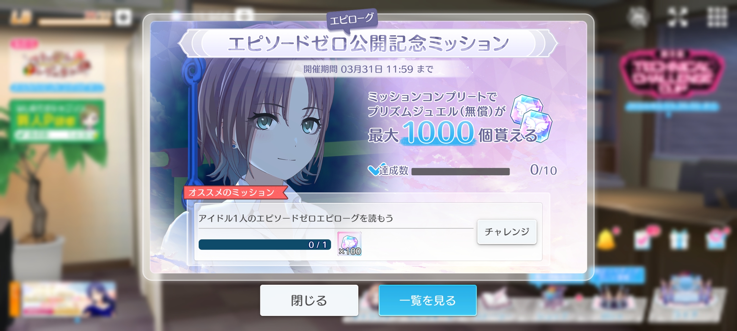 過去のエピソードゼロ追加記念ミッションと構成は同じ。エピソードゼロ5話まで読了済みのユーザーでもミッション報酬とストーリー読了報酬でプリズムジュエルが計2400個手に入るので、忘れずにクリアしよう。
