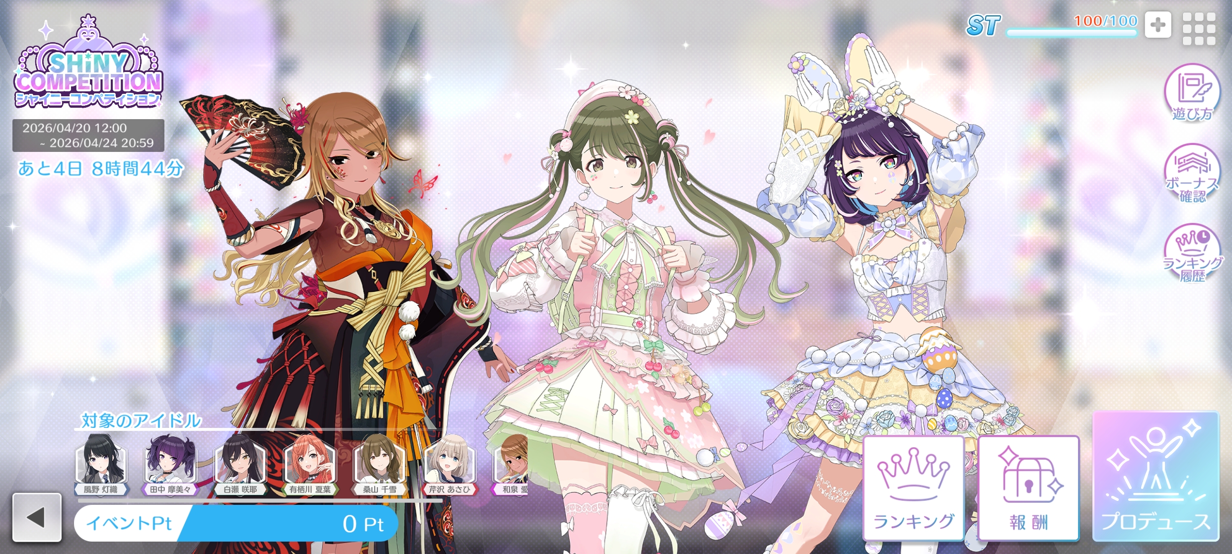 今回のシャイニーコンペティションは対象アイドルがなんと8人。必要プロデュース回数が多くなるなぁ……