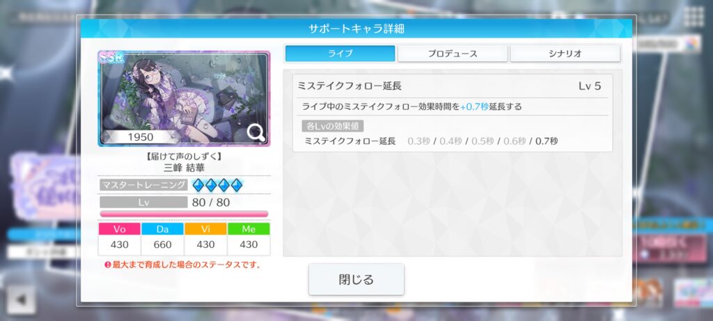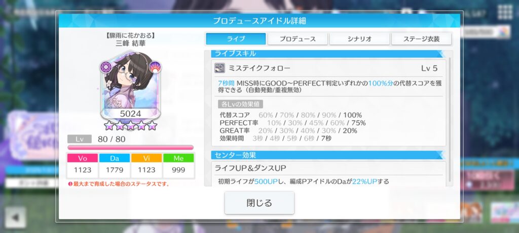 ライブ中のミステイクフォロー効果時間を+0.7秒延長する ※Lv5時