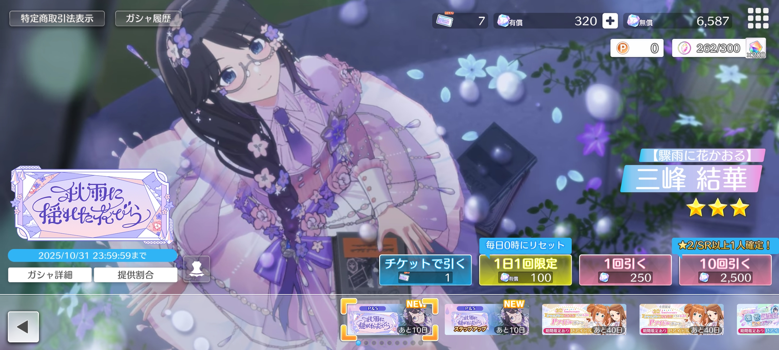 秋雨に揺れた花びら」ガシャのピックアップPアイドル・Sキャラは、★3【驟雨に花かおる】三峰 結華SSR【届けて声のしずく】三峰 結華のみとなります。