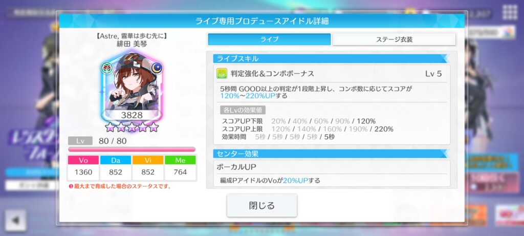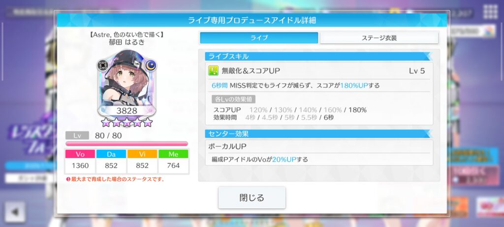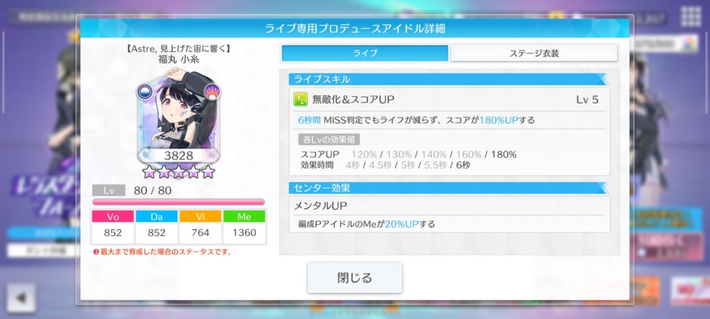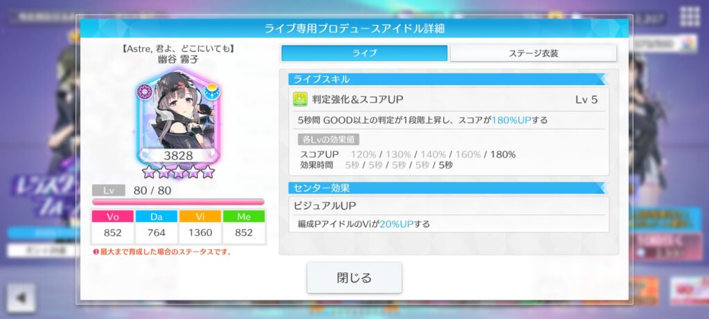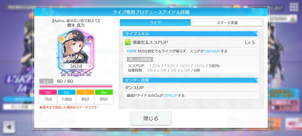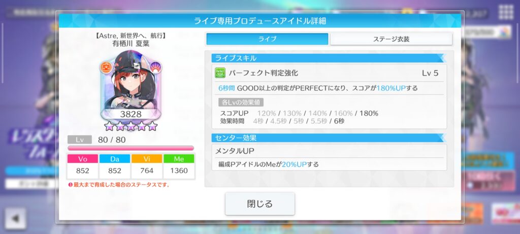 6秒間 GOOD以上の判定がPERFCTになり、スコアが180%する ※Lv5時