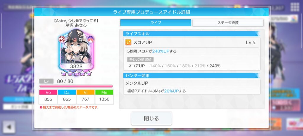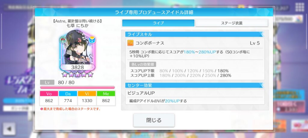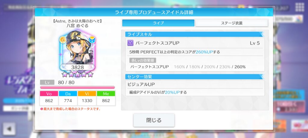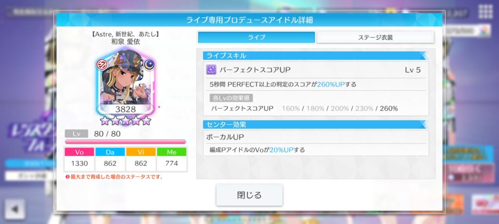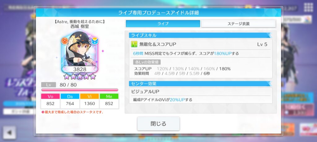 5秒間 PERFECT以上の判定のスコアが260%UPする ※Lv5時