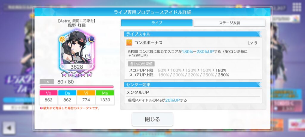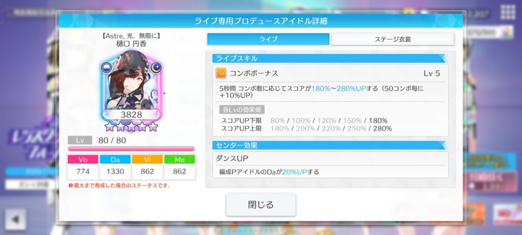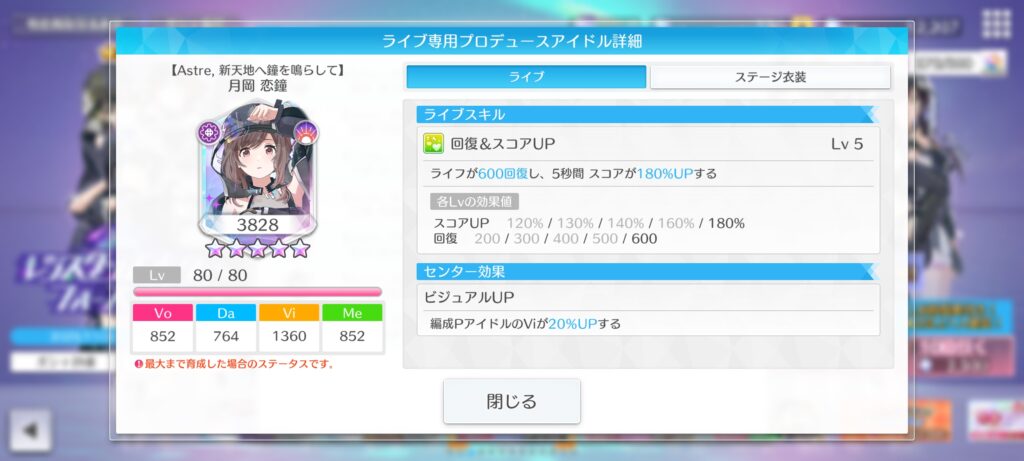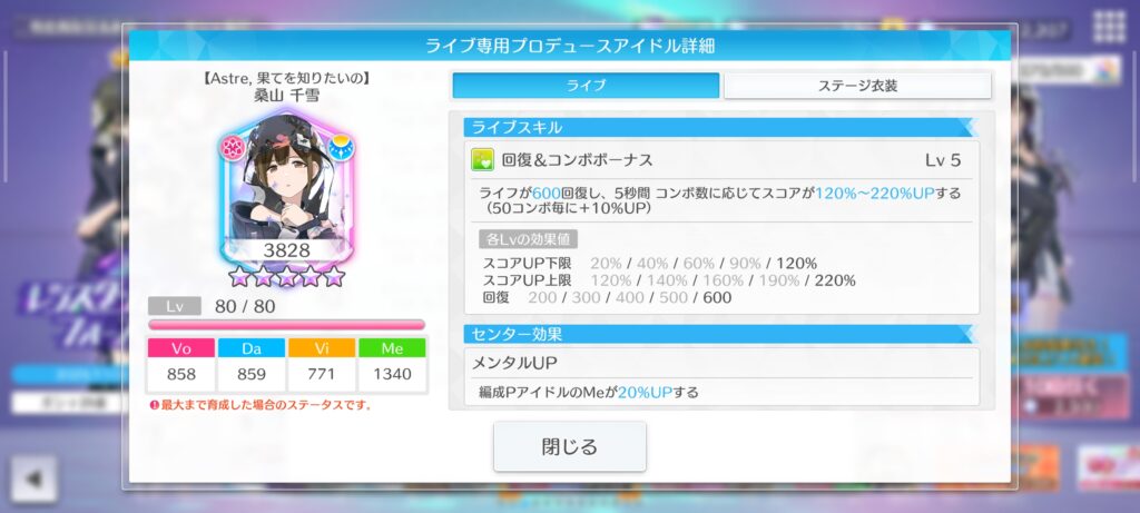 ライフが600回復し、5秒間 コンボ数に応じてスコアが120%~220%UPする(50コンボ毎に+10%UPする) ※Lv5時