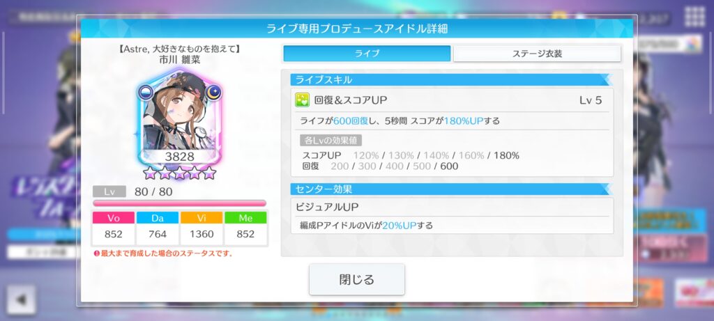ライフが600回復し、5秒間 スコアが180%UPする ※Lv5時