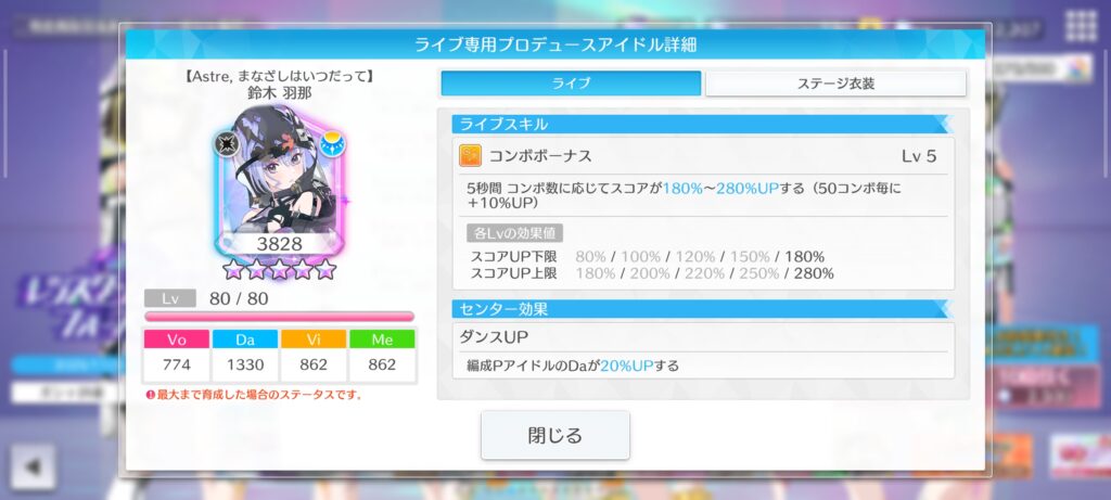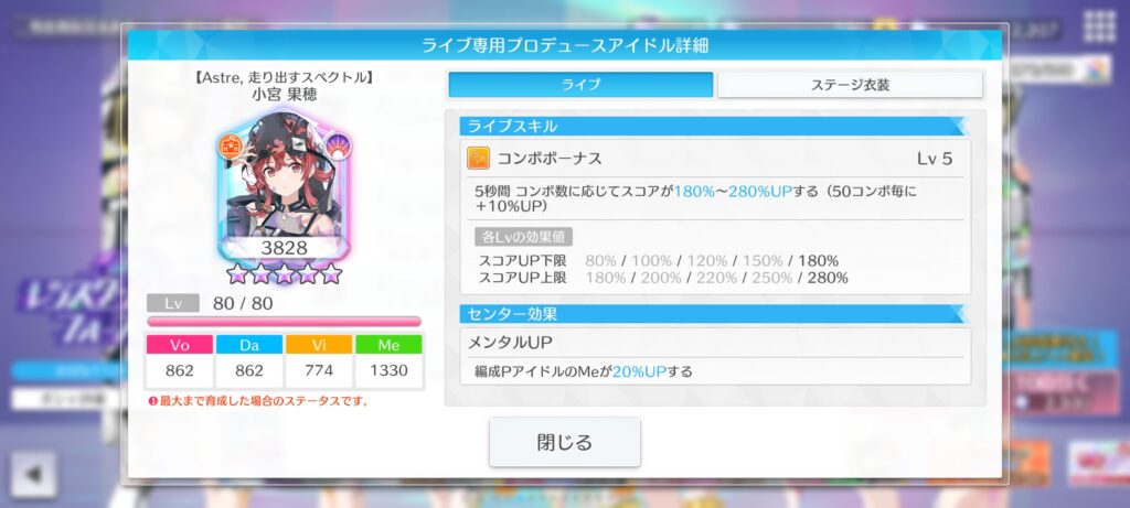 5秒間 コンボ数に応じてスコアが180%280%UPする (50コンボ毎に+10%UP) ※Lv5時