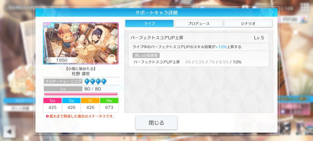 ライブ中のパーフェクトスコアUPのスキル効果が+10%上昇する。 ※Lv5時