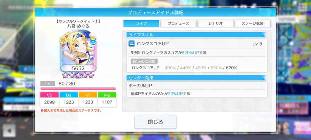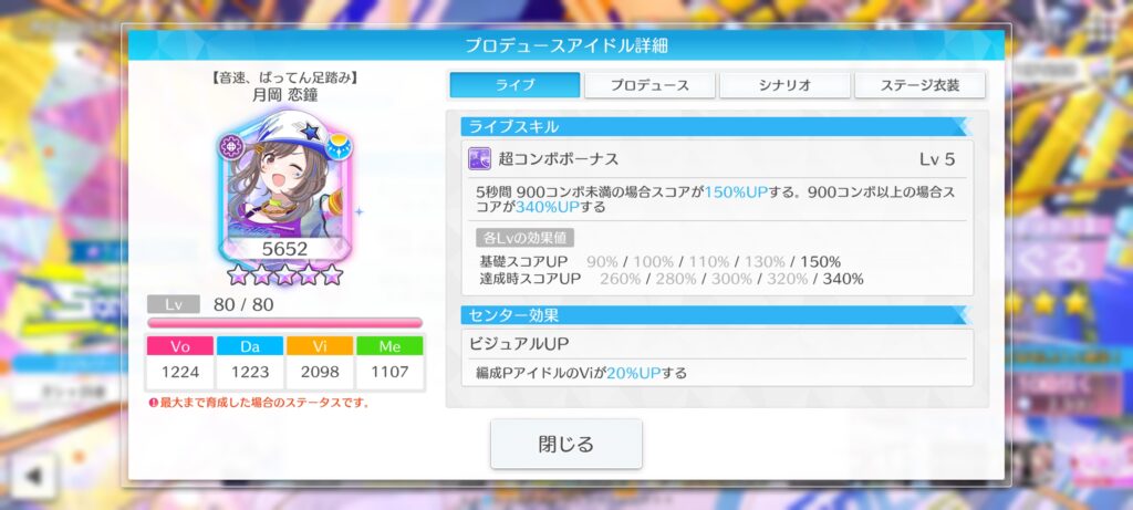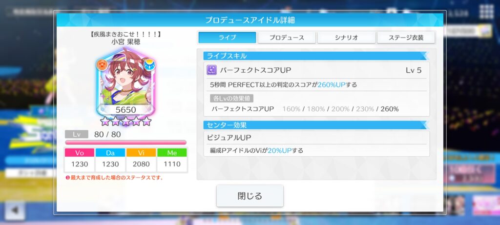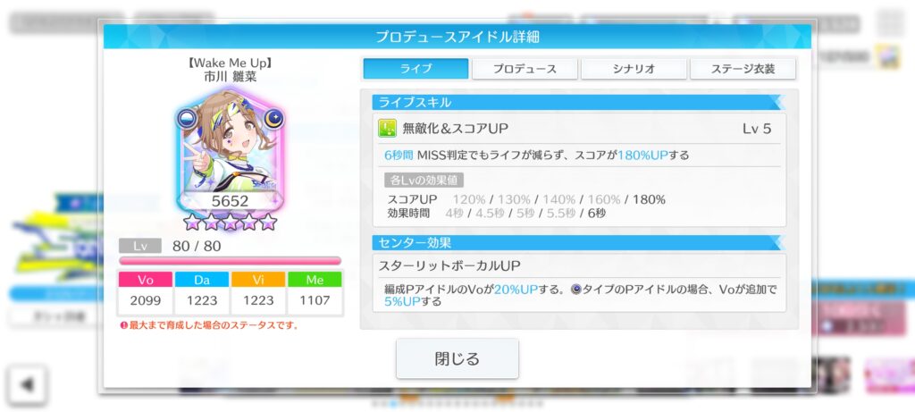 編成PアイドルのVoが20%UPする。スターリットタイムのPアイドルの場合、Voが追加で5%UPする