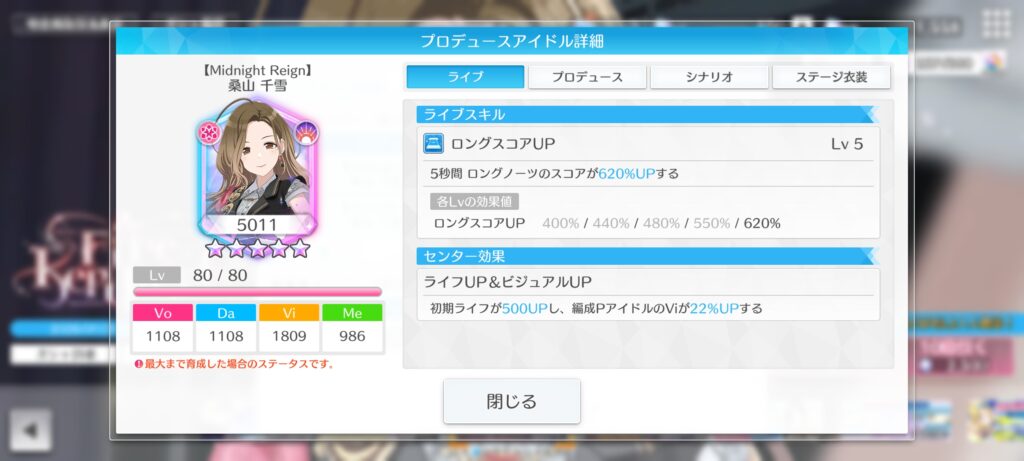 5秒間 ロングノーツのスコアが620%UPする ※Lv5時