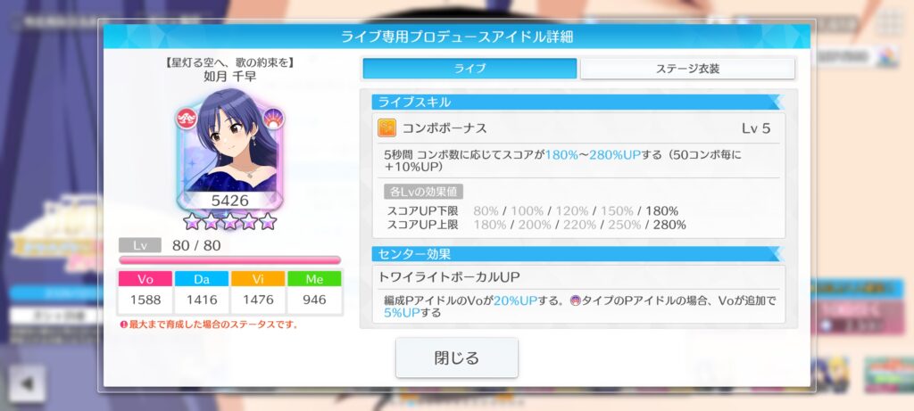 編成PアイドルのVoが20%UPする。トワイライトタイプのPアイドルの場合、Voが追加で5%UPする