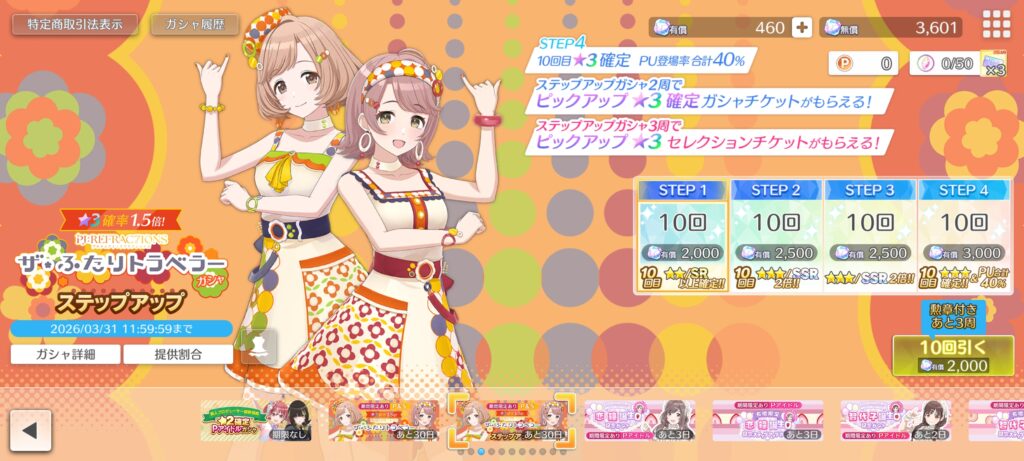 ステップアップガシャを2週すれば、「ザ・ふたりトラベラー ピックアップ★3確定ガシャ券」が手に入り、3週すると「ザ・ふたりトラベラー ★3セレクションチケット」が手に入るので、絶対欲しい人は、このガシャも検討しよう。