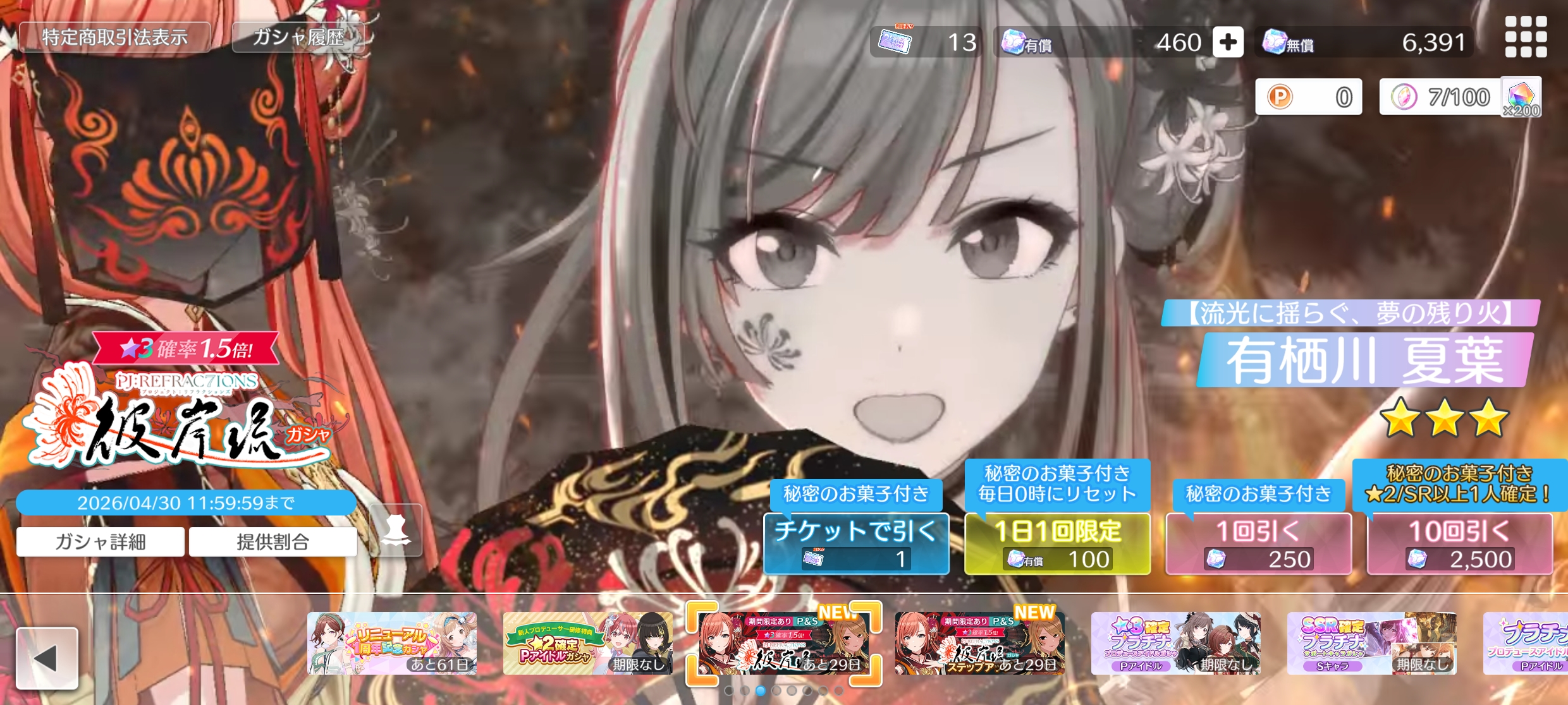 「PJ: REFRAC7IONS 彼岸流 ガシャ」ガシャには、有償限定のステップアップガシャもあります。